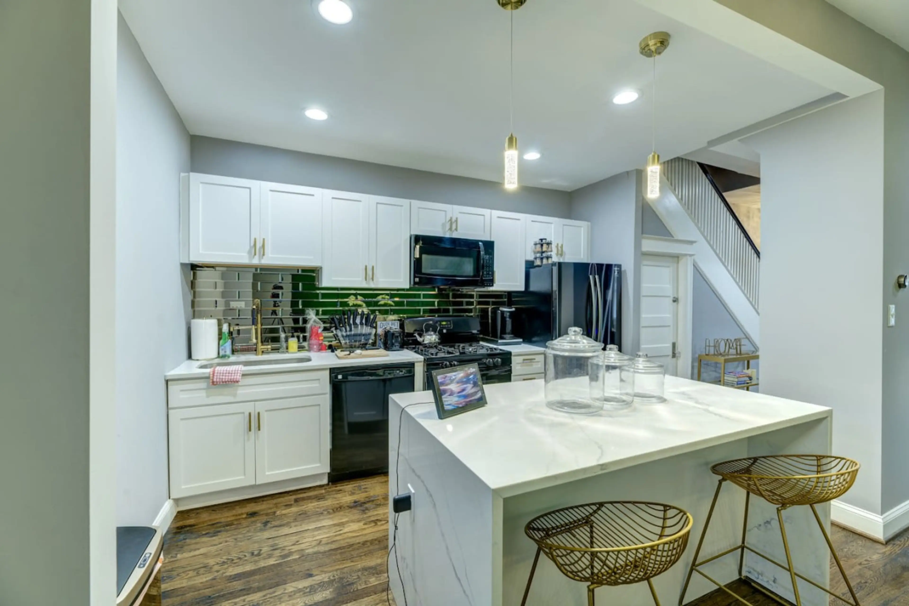 Pros: - off-street parking for 2 vehicles - 3 1/2 bathrooms - 3 bedrooms upstairs - basement apartment with additional sleeping area - laundry on-site - steps away from bus stop - easy to get to Metro station - Metro system in DC is excellent!Cons: - burnt out lightbulbs - some kitchen pans needed to be replaced - some kitchen pans were not clean - water and dead bugs in tea kettle - no bathroom hand towels or anywhere to hang one - door knob issues with a bedroom and bathroom - some interior spaces were quite tight, i.e. 1/2 bath on main floor and upstairs bedroom with en suite bathroom